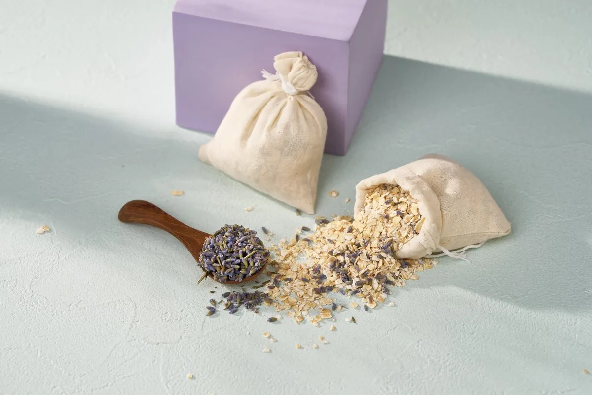 澡盆/浴缸注人適當溫度溫水,取出燕麥薰衣草澡包